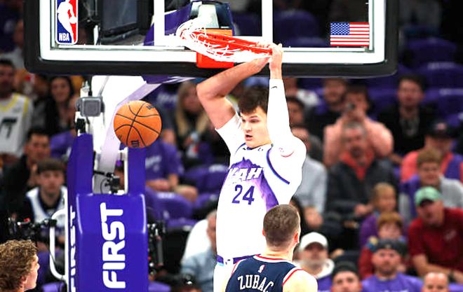 与快船的全力争冠不同,爵士上赛季以西部倒数第一收官,休赛期延续“重建核心”思路,操作重心围绕“积累潜力资产”展开。球队最大的收获来自选秀大会——用第五顺位摘下的埃斯-贝利,在季前赛交出场均16分4.7篮板1.7抢断的亮眼数据,展现出极强的攻防潜力:进攻端既能突破杀伤,也能完成外线投射;防守端的抢断能力(场均1.7断)更是契合爵士“防守建队”的传统,这位新秀已成为球队重建期的核心培养对象。但休赛期的引援操作对重建助力有限:签下的努尔基奇、尼昂、李凯尔三位球员,功能定位相对单一。努尔基奇上赛季场均11.5分9.2篮板,虽能提供内线篮板保护,却因移动速度较慢难以适配快节奏打法;尼昂与李凯尔均为功能性角色球员,缺乏带动团队的能力,无法为贝利等新秀提供足够的成长支撑。不过,马尔卡宁经过欧锦赛历练,状态正酣,凯斯勒经过一个夏季的特训,也在变得内线兼顾,爵士的实力有着一定的提升。但没想到这场比赛的进程完全超出了笔者的想象。